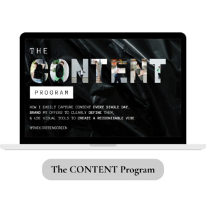 CONTENT is the self-paced program that shows you how to easily capture content every SINGLE day, brand YOUR offers to clearly define them, & use VISUAL TOOLS TO CREATE A RECOGNIZABLE BRAND and vibe that is uniquely yours.
